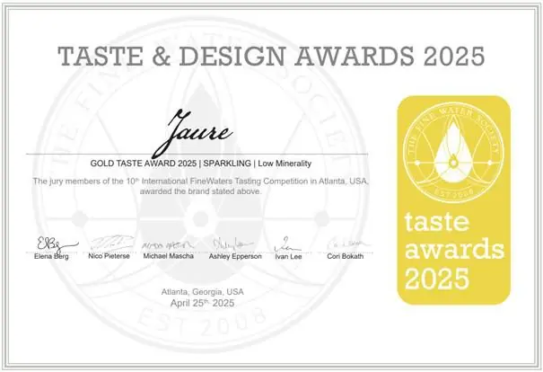 Jaure, a bottled water sourced from a deep spring in the granite mountains near Lake Vojmsjön in Vilhelmina (Lapland, Sweden), has achieved international recognition by winning a gold medal at the Taste & Design Awards 2025 in Atlanta, USA. Competing against over 100 brands from 30 countries, Jaure was awarded first place in the “sparkling water” category by a panel of expert water sommeliers from around the world.